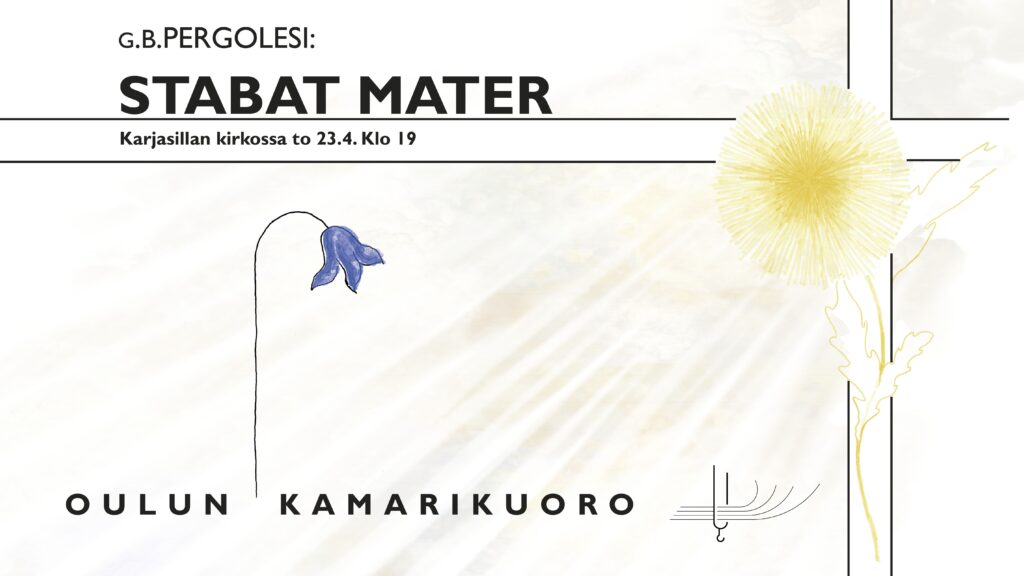 Stabat Mater on alun perin sävelletty kahdelle lauluäänelle, mutta se kuullaan tässä konsertissa englantilaisen urkurin ja pianistin Desmond Ratcliffen sovittamana sekakuoroversiona. Oulun Kamarikuoroa säestää viisihenkinen soitinyhtye ja solisteina laulavat kuoron omat tähdet Petra Rissanen ja Outi Aine. Konsertin johtaa Oulun Kamarikuoron taiteellinen johtaja Kristian Heberg.